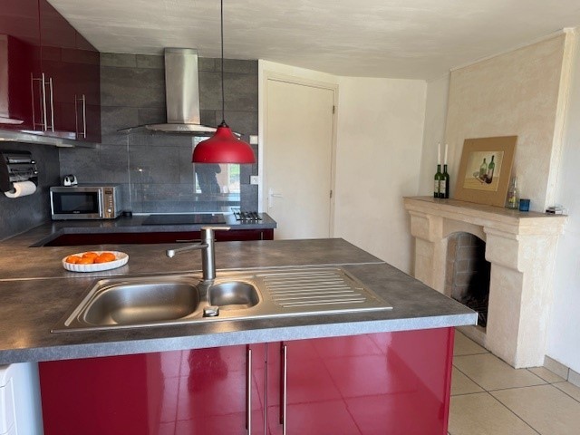 Kitchen with good range of units and also has a fireplace