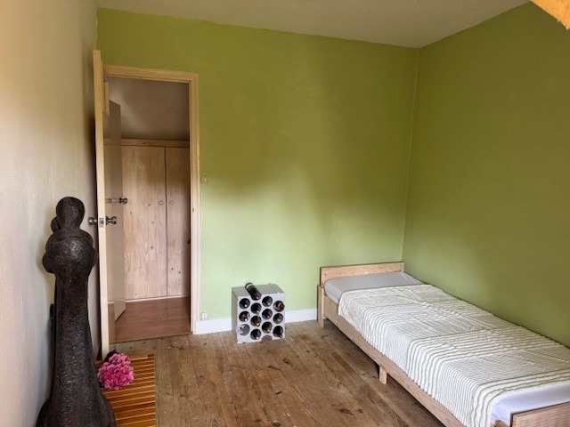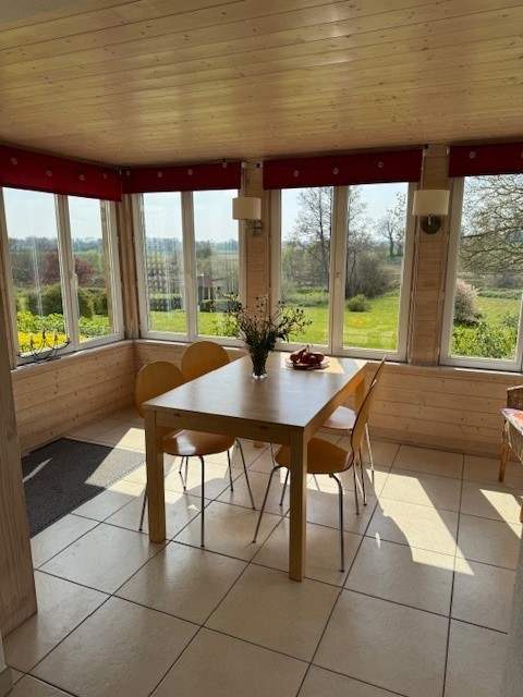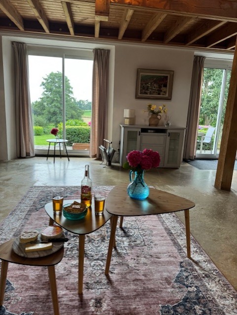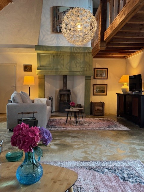 Open plan living room with woodburning stove – overlooks magnificent gardens – nice and bright due to size and number of the double glazed windows. Staircase to mezannine landing. This room is nice and bright with it being dual aspect. Not often you have such a large bright room in Normandy as often the north facing side of the houses often don’t have any openings. Patio doors to terassed outdoor area with panoramic views over garden from its elevated position. Passageway leading to