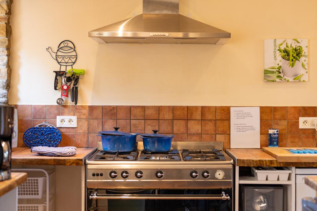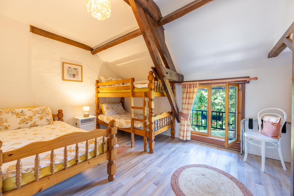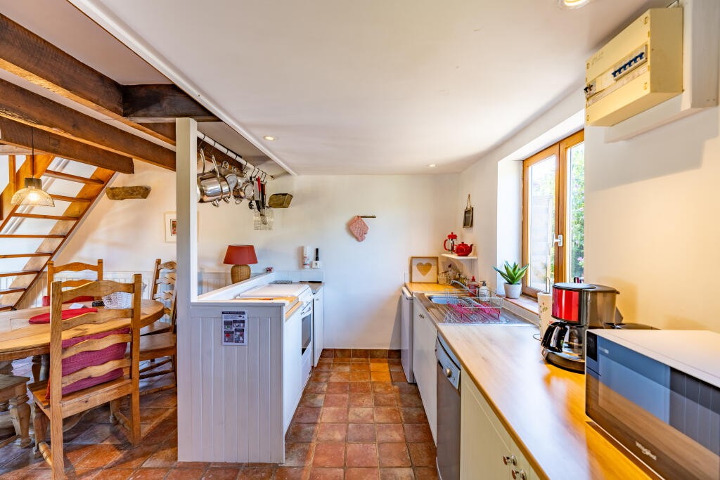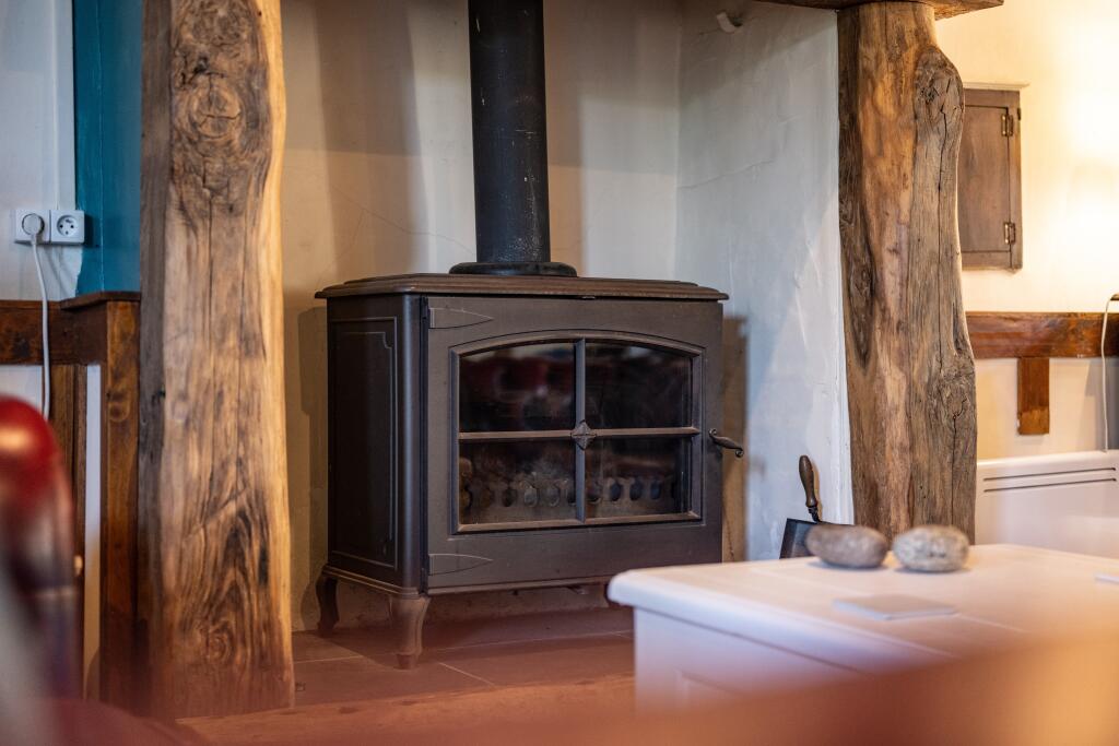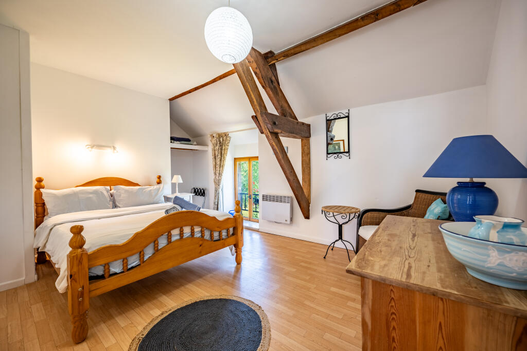 Gîte:A converted from a former barn, features an open-plan living and dining area on the ground floor, with two generously sized bedrooms and a bath/shower room on the upper level. The living area provides ample space for sofas and dining table capable of seating six guests comfortably. The space is enhanced by a large fireplace with a wood-burning stove, creating a warm and welcoming ambiance. The kitchen is fully equipped with modern appliances.